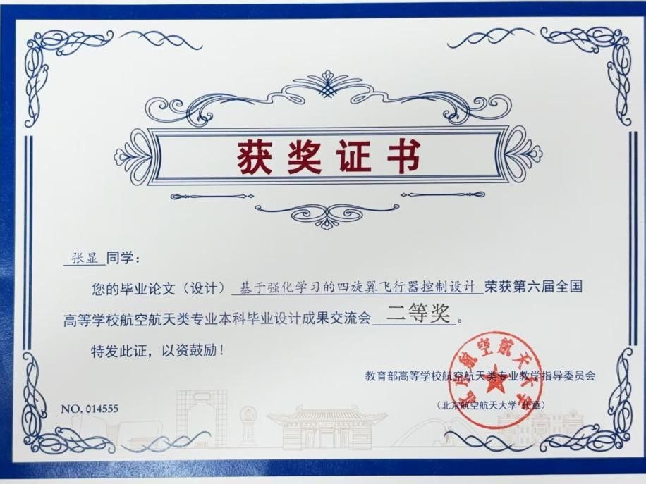 在此次高水平竞技交流中,重大学子表现出色,凭借扎实的专业功底和出色的创新能力斩获佳绩。张显同学的毕业设计《基于强化学习的四旋翼飞行器控制设计》(指导教师:吉洪蕾副教授)和赖泊林同学的毕业设计《基于无人机视觉的不规则区域识别与覆盖方法研究》(指导教师:吴宇副教授)荣获二等奖,季文俊同学的《考虑多旋翼气动干扰的共轴八旋翼eVTOL飞行特性研究》(指导老师:吉洪蕾副教授)荣获优秀奖。